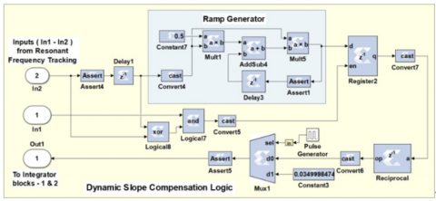 To facilitate the controller implementation onto the FPGA platform, the entire control system needs to be designed using Xilinx System Generator (XSG) block sets. Here, each sub-system is designed using various elementary, logical, control, mathematical and MCode blocks. The detailed design of DSC logic using XSG block sets is covered here. DSC logic is basically used to modify the slope of a ramp signal generated by an integrator block in the RFT loop (Figure 5). In design of this DSC logic using XSG block sets, a sample and hold concept is used. Its implementation using various logical, arithmetic operators, multiplexers, register, counter, reciprocal, and delay blocks is shown in Figure 6. To calculate the slope constant for the preceding integrator blocks, it processes the received comparator block outputs from the frequency tracking loop and generates the reference ramp signal. Here, at the start of each inverter cycle, the ramp generator is initialized to zero and it increments further with the constant slope. The peak of this ramp signal is sampled at the end of each cycle and stored in the register block. Network of logical and delay blocks generate the synchronous enable pulses for this register block, at the end of each cycle.