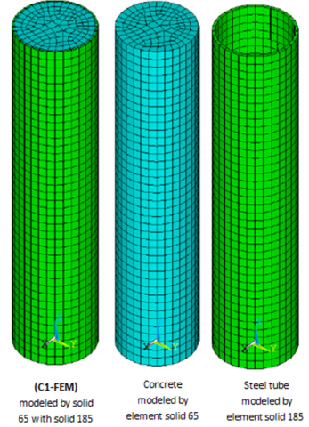 In the ANSYS model, no contact elements are used between the surface of SOLID 65 (representing concrete) and SOLID 185 (representing the steel tube). Instead, a bonded interaction is assumed, meaning that the surfaces between infilled concrete and surrounding steel tube behave as if they were permanently bonded, with no sliding or separation occurring.