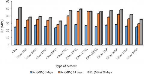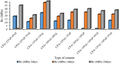 The results indicate that CPA cement shows better long-term strength compared to cements containing slag and limestone. The addition of slag enhances mechanical strength due to its pozzolanic effect, while limestone tends to reduce strength due to its inert effect. At 10% additive, the strength increases at 3, 14, and 28 days, but decreases for higher percentages (15% and 20%).