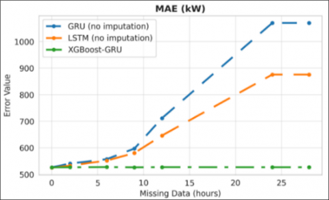 The experimental results demonstrate that the hybrid XGBoost-GRU model consistently outperforms the baseline GRU model across all missing data scenarios. As the proportion of missing data increases, the forecasting error of the baseline GRU model grows exponentially, whereas the hybrid model maintains relatively stable accuracy.