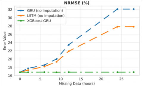 By contrast, the hybrid XGBoost-GRU approach demonstrates strong resilience. Its error values remain stable and closely aligned with those of the ideal scenario (no missing data), regardless of the duration of the missing interval. This highlights the effectiveness of the interpolation step in reconstructing informative input sequences and preventing the error saturation observed in the baseline GRU, LSTM.
