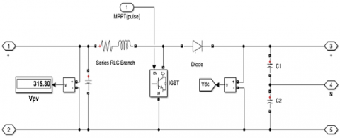 For connecting PV system to the grid, it is crucial to elevate the output voltage. This can be accomplished using a DC-DC converter, specifically a Boost converter, which increases the source voltage to a higher level. Figure 4 displays the Simulink model of the Boost converter, which consists of an input DC voltage source, filter capacitors C1 and C2, a diode, an inductor, and a controlled switch (IGBT). When the switch is in the ON position, the current flowing through the inductor increases linearly, while the diode remains OFF. Once the switch is turned OFF, the stored energy inside the inductor is released during the diode into the RC circuit. The converter output voltage is directly connected to its duty cycle [15].