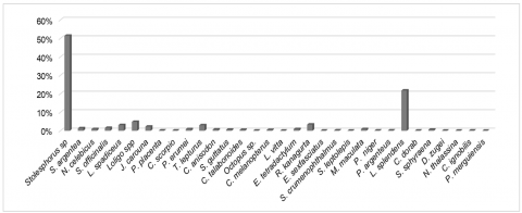 The observation (Table 1) revealed that the total biomass of fish and marine organisms caught amounted to 8,105 kg, comprising an estimated 3,416,234 individuals from 32 distinct species. The catch composition was dominated by Stolephorus sp. (anchovy) at 51.42%, Leiognathus splendens (ponyfish) at 21.79% and Loligo spp at 4.83%. Collectively, these three species accounted for over 70% of the total catch weight, indicating a pronounced dominance in the structure of the fish community (Figure 2).
