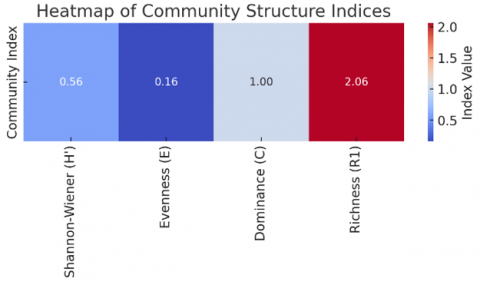 Figure 6. Heatmap of community structure indices illustrating index value gradients, indicating an ecologically simplified fish community