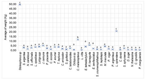 Figure 7. Mean catch weight per species (kg/unit) based on one-way ANOVA with Tukey's post hoc test (p < 0.05)