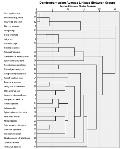 Species relationships were analysed using Hierarchical Cluster Analysis (HCA) (Figure 8) with an average linkage method, resulting in a dendrogram delineating several major clusters. Based on morphological similarities, the captured species were grouped into clusters exhibiting varying levels of taxonomic distance. Species with comparable body forms and tail morphologies, such as Sepia officinalis, Loligo sp., and Octopus sp., were grouped at lower similarity distances. In contrast, Cloridopsis scorpio, Penaeus merguiensis, and Placuna placenta formed distinct clusters, reflecting greater morphological divergence from the Osteichthyes group.