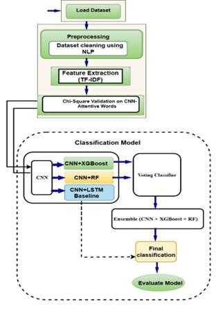 A binary feature vector representing validated keywords is created from the “sanctioned” vocabulary. XGBoost and Random Forest employ this small, interpretable vector instead of TF-IDF. This stage ensures that tree-based models only use neurally and statistically valid lexical signals, a major improvement over previous work. The original CNN-LSTM processes the whole input sequence in parallel, retaining long-range dependencies and nonlinear semantics. A confidence-weighted soft voting technique fuses the outputs of the solo CNN, CNN+LSTM, CNN+XGBoost, and CNN+RF hybrid models. This strategy gives models with internal feature significance that match the sanctioned feature set greater weight than uniform voting, ensuring consistency among diverse learners. This ensemble determines the final classification, which is evaluated using accuracy, precision, recall, and F1-score. The modular architecture of the graphic hides a new paradigm: harmonizing models' cognitive underpinnings through shared feature validation and dynamic weighting.