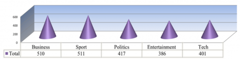 The BBC news dataset contains 2,225 raw text documents from 2004 to 2005 from the BBC news website spanning five subject categories. The text documents are grouped into five folders (business, entertainment, politics, sport, tech) with articles for each area. A corpus was used to evaluate the proposed method for identifying the ideal answer. This test used BBC news data; details. This English dataset is based on BBC news websites from 2004 and 2005. The BBC Dataset Visualization shows its five classifications in Figure 2. This collection comprises 2225 items, including many articlesو and it can be obtained from Kaggle website (https://www.kaggle.com/bbc-news).