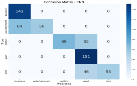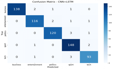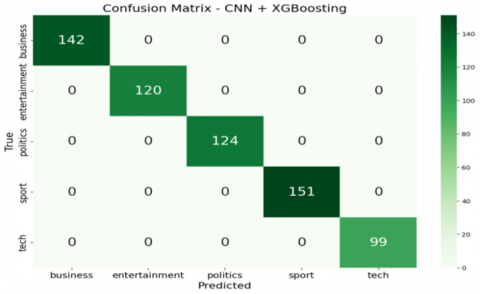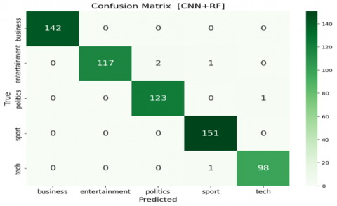 The CNN+XGBoost model achieved perfect classification across all five BBC news categories with no misclassifications, while CNN+RF demonstrated only minimal misclassification, primarily within the "tech" and "entertainment" classes. The CNN+LSTM model performed well but showed slight confusion among closely related categories. The baseline CNN model, in contrast, exhibited the most misclassifications, especially between “entertainment” and “politics.” These results demonstrate that integrating CNN with optimized ensemble classifiers leads to superior classification performance. The optimal model selection may vary depending on task-specific goals, dataset complexity, and available computational resources. In addition to the analysis of misclassified cases, the documents, together with the confusion matrices, illustrate the areas of difficulty for each model. As an example, the standalone CNN model wrongly classifies the content of 64 “entertainment” articles filed as “business” and 56 as “entertainment”. Likewise, 46 “tech” articles were wrongly classified as “sport”. The sheer volume of misclassification indicates the basic CNN model’s inability to grasp the distinctions among various news categories. The CNN+LSTM model has improved but is still prone to a few misclassifications. As an example, it classifies 2 “entertainment” articles under “business” and 2 articles under “politics”. The enhanced performance of the ensemble and boosting models stems from the fact that they are able to fix the shortcomings of the weak models. By leveraging the CNN’s strength in feature extraction and the XGBoost and Random Forest’s predictive capabilities, these models can classify news articles with greater precision. This is a clear illustration of the strength of ensemble learning, where the use of several models results in a classifier that is more accurate and robust than what any single model is able to produce.