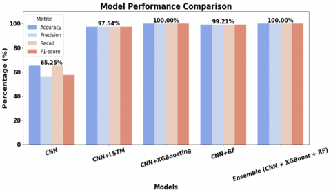 Model performance across CNN-based architectures is compared in Figure 4 using four assessment metrics: F1-score, recall, accuracy, and precision. Using just the baseline CNN model, which has an F1-score of 56.77% and an accuracy of 65.25 percent, yields the worst results across the board. The model's performance is enhanced across all criteria, attaining over 97% accuracy, by merging CNN with LSTM. Incorporating XGBoosting into CNN produces flawless outcomes on all metrics, reaching a performance level of 100%. Similarly, CNN + Random Forest is an effective classifier since it keeps accuracy high (99.21%) and recall and precision balanced. The ensemble model (CNN + XGBoost + RF) achieves the best overall performance, reaching 100% across all measures consistently. This proves that the suggested ensemble approach is resilient and can generalize well. The results show that when deep learning and ensemble methods are used together, the classification performance on text data is much improved. In addition, the Key Hyperparameters for models in Table 2.