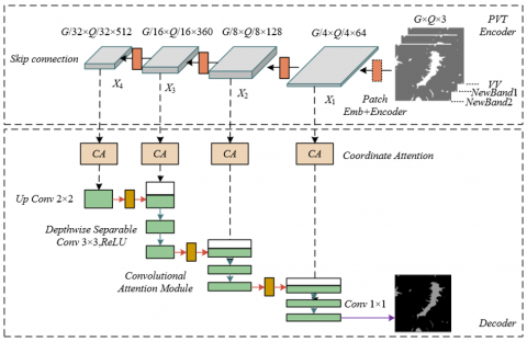 Rather than directly adopting the original Pyramid Vision Transformer (PVT) model, the upgraded version, PVTv2, was selected and further optimized, reflecting deliberate design considerations within the encoder module. First, the fixed-size positional encoding used in the original PVT cannot flexibly adapt to varying input image sizes, which represents a critical limitation in practical remote sensing applications where cropping or differing scene dimensions frequently lead to inconsistent input sizes. PVTv2 addresses this issue by employing a zero-padding strategy to implement a simple yet effective positional encoding scheme, thereby equipping the model with the ability to process images of arbitrary dimensions and significantly enhancing its practicality and flexibility. Second, the high spatial resolution of remote sensing imagery imposes considerable computational complexity. PVTv2 alleviates this by replacing the spatial-reduction attention of the original PVT with linear-complexity remote sensing imagery, thereby markedly reducing the computational burden of self-attention on high-resolution feature maps. This ensures efficiency when handling large-scale remote sensing data, making the deployment of a high-performance Transformer backbone feasible for real-world applications. Finally, the classification head originally designed in PVTv2 for image classification tasks was removed. Consequently, the encoder output is no longer a single categorical label but instead consists of multi-level feature maps (X1-X4) that preserve full spatial dimensions. These multi-scale feature maps, enriched with information at different hierarchical levels, are directly transmitted to the decoder through skip connections, thereby providing a comprehensive information foundation for subsequent pixel-level semantic segmentation.