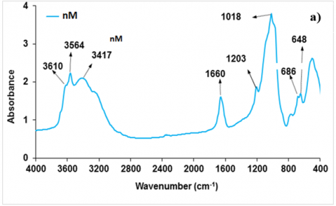 The FTIR spectra of nM, mod-nM/3APTS, and (mod-nM/3APTS)/MB are presented in Figure 1(a-d). In the spectrum of nM (Figure 1(a)), characteristic absorption bands at 3610 and 3564 cm⁻¹ correspond to the stretching vibrations of Mg-OH groups, while the band at 3417 cm⁻¹ is attributed to hydrogen-bonded hydroxy groups and adsorbed water. The peak at 1660 cm⁻¹ represents bending vibrations of molecular water coordinated with magnesium, and the strong bands observed at 1018 and 1203 cm⁻¹ are assigned to Si-O and Si-O-Si stretching vibrations of the silicate framework. The band at 648 cm⁻¹ corresponds to Mg-OH bending vibrations. After modification with 3APTS (Figure 1(b)), new features emerge, including the appearance of a C-H stretching band at 2931 cm⁻¹, confirming the incorporation of organic groups from the modifier. The slight shifts in the hydroxyl bands (3556 and 3425 cm⁻¹) and changes in the intensity of Si-O bands further indicate successful surface functionalization. Following MB adsorption onto the modified adsorbent (Figure 1(c)), new peaks appear at 1011 and 974 cm⁻¹, while the broad -OH region shows a notable reduction in intensity, suggesting strong interactions between MB and the surface functional groups. The peaks near 1606 and 1203 cm⁻¹ become sharper, reflecting the contribution of MB aromatic and C-N groups. These spectral changes collectively confirm that MB molecules were effectively adsorbed onto the mod-nM/3APTS surface through electrostatic interactions, hydrogen bonding, and possible chemisorption mechanisms. In Figure 1(d), the pristine nM spectrum shows characteristic bands of hydroxyl and silicate groups, including broad peaks in the region of 3600-3400 cm⁻¹ attributed to -OH stretching vibrations, a band at ~1660 cm⁻¹ associated with adsorbed water, and strong Si-O and Si-O-Si stretching vibrations around 1200-1000 cm⁻¹. After surface modification with 3APTS, the mod-nM/3APTS spectrum exhibits a new band at ~2930 cm⁻¹ corresponding to C-H stretching1vibrations, confirming the successful grafting of organic groups. Slight shifts in the hydroxyl bands and variations in Si-O peak intensities further support the functionalization of meerschaum. In contrast, the spectrum of MB-loaded mod-nM/3APTS shows significantly reduced intensity of the hydroxyl stretching region, along with distinct peaks near 1600–1200 cm⁻¹ that overlap with MB aromatic and C-N vibrations. These changes indicate strong electrostatic and hydrogen bonding interactions between MB and the amine-functionalized surface. This observation supports and aligns with results reported in prior studies [21-25].