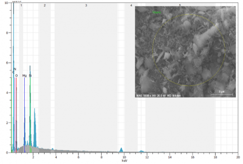 The corresponding EDX spectrum confirms the elemental composition of nM, showing prominent peaks for magnesium (Mg), silicon (Si), and oxygen (O), which are the primary constituents of meerschaum, consistent with its chemical formula (Si₁₂Mg₈O₃₀(OH)₄(OH₂)₄·8H₂O). Minor traces of other elements may also be detected, likely originating from impurities or natural mineral inclusions. The strong presence of Si and Mg peaks validates the silicate framework, while the O peak reflects both structural oxygen and surface hydroxyl groups.