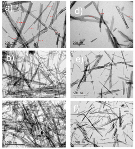 Figure 4(a-c) shows the TEM images of nM, and Figure 4(d-f) shows the modified meerschaum with 3-aminopropyltriethoxysilane (mod-nM/3APTS). The TEM images of nM reveal a dense and intertwined fibrous structure, where the long fibers are closely packed and form combined networks, exhibiting a typical needle-like nanoscale morphology. In contrast, the mod-nM/3APTS samples display shorter fibers that are less entangled and more separated from each other, indicating that the modification process significantly alters the aggregation behavior of the fibers while maintaining their needle-like nanosized features. To further characterize the samples, a UV-Visible spectrophotometer (Shimadzu UV-1700) was employed to determine the residual dye concentration in adsorption experiments, a pH meter (Orion 900S2) was used for pH measurements, and a GFL 3033 shaker was applied to ensure proper mixing of the adsorbent-dye solutions. Additionally, the functional groups on the adsorbent surfaces were examined using a Bruker VERTEX 70 FTIR spectrometer, and all surface peaks were identified and explained.