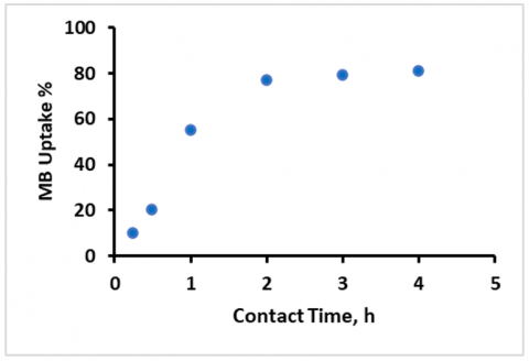 The variation of MB uptake with contact time at pH 7 and constant temperature is shown in Figure 6. The adsorption process displays a rapid initial increase in MB uptake, reaching approximately 55-60% removal within the first hour. This indicates that a large number of active sites on the mod-nM/3APTS surface are readily available for dye molecules at the start of the process. As the contact time increases to 2 hours, MB uptake reaches about 75-78%, after which the rate of adsorption slows considerably. Beyond 3–4 hours, the adsorption curve begins to plateau at around 80% uptake, signifying that equilibrium has been reached and most of the available adsorption sites have been occupied. Based on these observations, a contact time of 2 hours was selected as the optimal duration for subsequent experiments, since it provides near-equilibrium adsorption with minimal additional uptake beyond this point. The initial rapid adsorption phase can be attributed to the abundance of active sites, while the slower phase reflects the gradual saturation of the adsorbent surface.