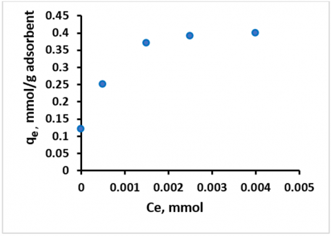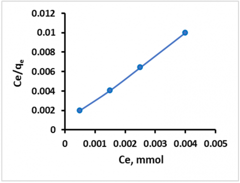 $\frac{\mathrm{Ce}}{\mathrm{qe}}=\frac{1}{\mathrm{Q}_{\mathrm{0}} \mathrm{K}_{\mathrm{I}}}+\frac{1}{\mathrm{Q}_{\mathrm{0}}} \mathrm{Ce}$ (4)
