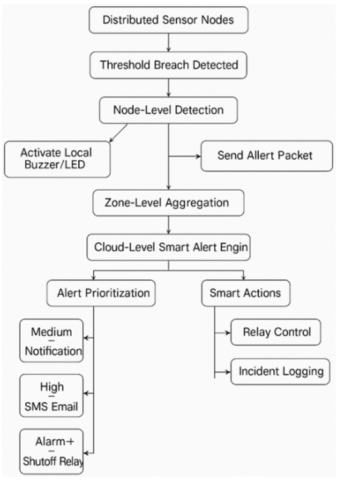 To meet the needs of large industrial facilities, the proposed system architecture is extended into a distributed, networked system comprising multiple sensor nodes strategically placed throughout the plant. Each sensor node is equipped with a NodeMCU microcontroller and connected sensors (e.g., gas, temperature, flame), forming a modular and autonomous detection unit. These nodes send data via Wi-Fi to a centralized cloud analytics platform, as shown in Figure 2.
