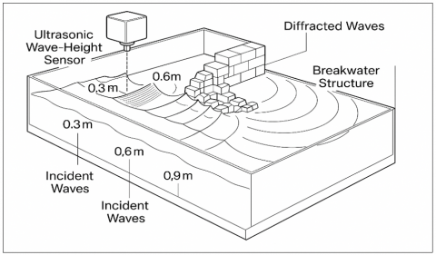 Experimental research has played a crucial role in validating and extending theoretical predictions. Flume and basin studies have documented wave focusing, shadow zone formation, and nonlinear amplification under a range of wave steepness and structural conditions [8, 9]. Investigations of porous and Helmholtz-type breakwaters have revealed how internal resonance and damping mechanisms modify diffraction efficiency and energy transmission [10]. Similarly, experiments on flexible and V-shaped structures demonstrated that geometric and dynamic properties can amplify or suppress diffracted wave crests [11]. Although these works have advanced understanding of wave–structure interactions, they primarily focus on geometry, porosity, or wave period, while incident wave height is often treated as a secondary or fixed parameter.