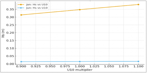 (1) Wind speed (±10%): January conditions showed ~±9% variation in Hs, while June showed a negligible change due to fetch-limited conditions.