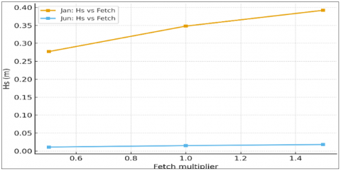 (2) Fetch (±50%): In January, Hincreased by ~41% with longer fetch, while in June changes were minimal.