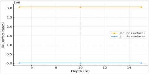 (3) Depth (5–15 m): Surface Reynolds numbers remained turbulent, but near-bed orbital velocities declined exponentially with depth.
