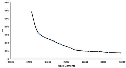 The numerical model of the cavity was built using the ANSYS Workbench program, where the numerical mesh was generated using the ANSYS Meshing tool. The model consists of a chamfered square enclosure, inside which there is an internal body representing a cylinder of various geometric shapes. Four-cylinder shapes have been studied, namely: square, circular, horizontal ellipse, and rhombus, as shown in Figure 2. An irregular numerical mesh (unstructured mesh) consisting of triangular and quadrilateral elements, with a pronounced thickening of the mesh around the inner shape, was used to increase the accuracy of calculations in areas where sharp changes in flux or heat transfer are expected. The distribution of the mesh is also gradually improved from the boundaries of the inner shape towards the walls of the outer cavity, providing an effective numerical representation while maintaining the stability of numerical solutions. For objects with sharp angles (such as square and rhombus shapes), the cells were additionally reduced in size around the corners to reduce the possible numerical error caused by the concentration of thermal or fluid voltage. In the case of the round and oval shapes, a symmetrical and smooth mesh has been generated around the curved border to facilitate the representation of flow and flowability. This variety of geometric shapes is aimed at studying the influence of the internal shape of the cylinder on the temperature distribution and the behavior of the flow inside the cavity, which enhances the understanding of physical phenomena associated with heat transfer by natural or forced convection. Figure 3 illustrates the mesh independence test for the numerical solution used in this study. It can be observed that the Nusselt number (Nu) clearly decreases with an increase in the number of mesh elements. A significant change in values is evident at low numbers of elements, after which the values gradually stabilize when the number of elements exceeds approximately 27,000. This behavior indicates that the numerical solution becomes independent of the mesh size beyond this point, demonstrating the efficiency of the chosen mesh resolution in representing the physical domain without an unnecessary increase in the number of computational elements.