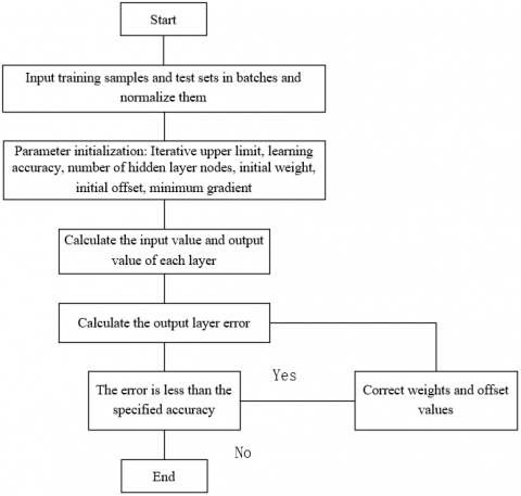 The neural network can obtain a set of output vectors from the input vectors, but since the initial weights and the offset values of the neural network are given randomly, the designed neural network is only making some random judgments and cannot operate in the way we expect. Therefore, we must "train" the neural network to achieve the goal of "learning." As a common method in machine learning, neural network has many ways of learning. The BP (Back Propagation) algorithm is studied in this paper. The flow chart of BP neural network algorithm is shown in Figure 2.