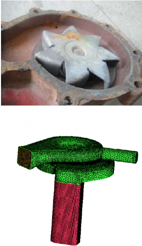 This paper applies the coefficient-corrected k-ω SST turbulence model to the flow field calculation of the centrifugal pump of automobile motor. The structural parameters are as follows: the blade z=7, the impeller diameter is18mm, the volute is involute, the minimum gap between the shell of volute tongue and the impeller is 0.5mm, and the minimum distance between the bearing surface and the impeller is 1mm. For better solution convergence, a triangular prism mesh network is pulled out from the outlet of water pump with long cooling circulation. The mesh is shown in Figure 1.