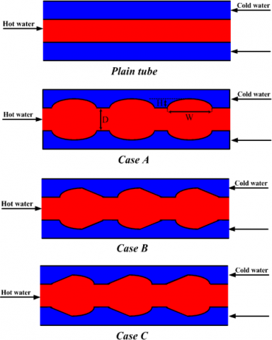 Firstly, semi-elliptical corrugations (case A) were used on the inner tube of the double-tube heat exchanger. Then, modified corrugations consisting of a quarter of an elliptic and an inclined line were used in order to delay separation of flow compared to case A. Modified corrugations with two arrangements of co-flow-direction (case B) and counter-flow- direction (case C) were investigated. Three different heights of corrugations (H) including 2.5, 3.75 and 6 mm were used in designing the semi-elliptical while in all cases; the axial diameter of the ellipse (W) was kept at a constant value of 15 mm.