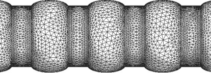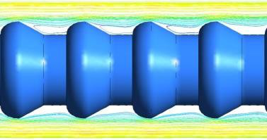 Streamline around the inner tube of the double-tube heat exchanger is shown in Fig.5. As it is observed, separation of flow happens in upper hand of corrugations. Separation of flow decreases the heat transfer.