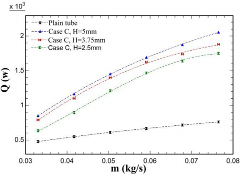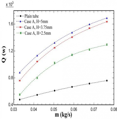One of the advantages of corrugated tubes is the increase in heat transfer surface and turbulence in the flow. Therefore, using corrugated tubes increase heat transfer in a double-tube heat exchanger. The amount of improving heat transfer by using corrugated tubes depends on corrugation shapes. Changes in heat transfer with hot water flow rate for semi- elliptical corrugations (case A) are shown in Fig.4. As it is observed, increase in corrugation height (semi-elliptical vertical diameter) increases the heat transfer. Heat transfer in the double-tube heat exchanger with semi-elliptical corrugations was 1.15 to 2.22 times more than the plain double-tube heat exchanger.