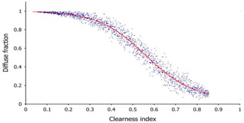 As said, decomposition methods focus on a simple description of the physical phenomenon, which is often reported as a “sigmoid” curve, which poses in relation the diffuse fraction and the clearness as from the example image of Figure 1. In fact, in such a figure, to quantify and describe the different weights of direct and diffuse fraction, two non- dimensional quantity, namely, the diffuse fraction, kd, and the clearness, kt, defined as follow, are introduced: