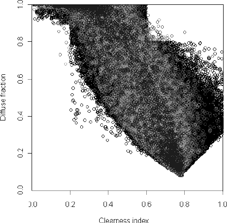 Data is in any case recorded for long periods of time and the resulting kd-kt graph often present a pronounced scatter of points due to the variation, within days, weeks etc., of the atmospheric physical condition from the point of view of seasonal effects, chemical pollutant presence, average cloudiness and so on.Raw data are usually integrated over periods of minutes or hours and, due to the experimental origin, they are usually subjected to a preliminary conditioning to eliminate physical inconsistency.