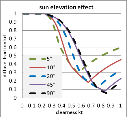 Figure 5. Skartveit diffuse fraction model [15]. Influence of solar elevation.