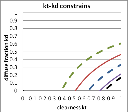 The true point instead is that the kd-kt sigmoid stops at some point in the right–low part of the diagram due to the described constraints described in this work. Experimental points around that limit are a consequence of the variability of some atmospheric or ground characteristics during the observation period (usually very long). Possible parameters are ground and cloud albedo and various transmission coefficient linked both to beam and diffuse radiation. Finally, the presence of clouds represents the more important stochastic factor in modeling the component of solar radiation; this first-step study is made under the assumption of clear – cloudless sky.