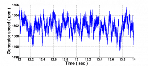 The stator voltage as shown in Figure 7 is balanced, constant and maintained at its rated value. Also, the rotational speed is constant irrespective of wind speed value. However, it is not entirely constant and there are some variations that shown in Figure 8. However, the generator speed may vary only a small percent from its nominal value which is up to 1 %. The rated generator speed under study is 1500 rpm and 50 HZ, so 1 % represents about 15 rpm. Our result in Figure 8 shows that the variation is about 6 rpm which represents 0.4 % from the rated value. This type of wind generation is normally referred to as fixed speed.