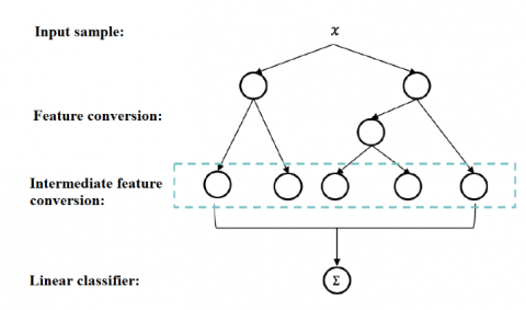 For an input sample x, a binary sequence of falling points was obtained after the sample was processed by the integrating tree. Each falling point was marked as one, and each non-falling point, as zero. The sequence was regarded as a transformed feature, and subjected to logistic regression training to produce a logistic regression model.