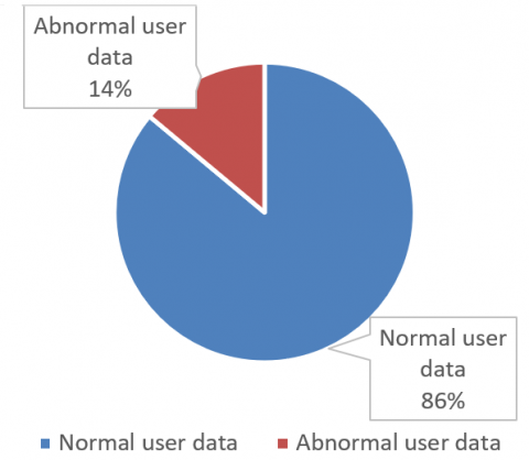 Figure 3 compares the data volume of normal users with that of abnormal users. It can be inferred that, out of the 27.16 million data, 23.38 million belong to normal users and about 3.78 million belong to abnormal users.
