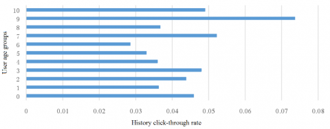 (1) Extraction of user features. Firstly, the historical CTRs of users in ten age groups, denoted as 0~10, were counted (Figure 5). The results show that the historical CTRs of different age groups varied from 0.03 to 0.07. Hence, age group was taken as a feature vector of ad CTR prediction.