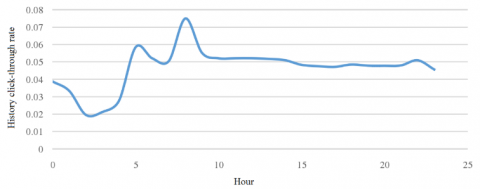 The historical CTRs of the ad appearing at different hours (0~23) were also counted (Figure 9). In the original dataset, there is a timestamp field in the format of “year-month-day hour: minute: second” (e.g. 2019-02-13 17:25:30). The results show that the CTR was constantly changing throughout the day. Thus, the hour and minute were both extracted, serving as two separate features for the prediction of ad CTR.