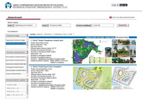 There are three display modes: strategy list preview, strategy summary preview, and thumbnail preview. Take the integrated design between recreational facilities and disaster prevention facilities for example. Once the query conditions and calculation methods were set, the corresponding strategy was displayed in the summary preview.