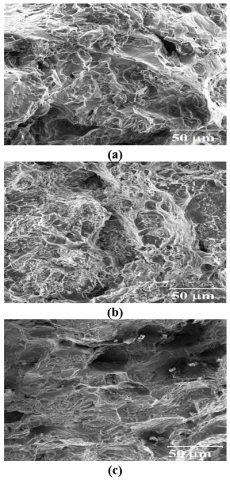 Figure 6. Fractography of (a) AA8011, (b) AA8011 - 4 Wt. % TiB2 and (c) AA8011- 8 Wt. % TiB2