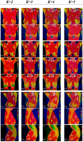 From this study, it is believed that the 1D Otsu’s between class variance method outperforms 1D Kapur’s entropy based technique. Because, infrared images, mostly have low contrast features. Therefore, between class variance helps us to compute optimal threshold values for separating different classes. It seems that the between class variance information is more than the entropy information in thermograms. In summary, the suggested multilevel colour image thresholding technique is useful for thermogram image analysis.