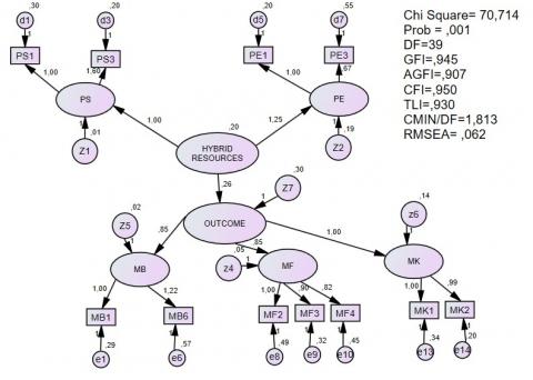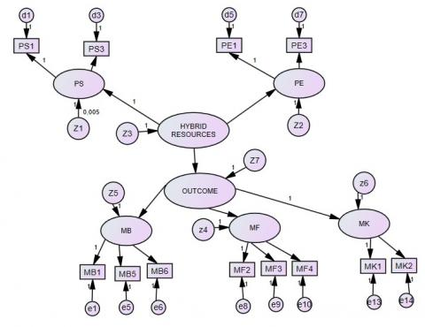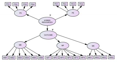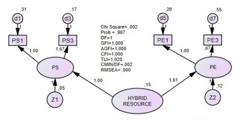 Based on the results of the CFA second-order test, the effect of the hybrid resources on the outcome latent variable is described as follows.