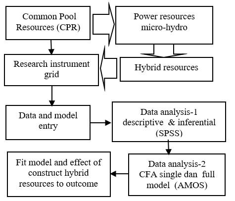 This is a quantitative research using qualitative data quantized. The research is based on the conceptual theory of the Institutional Framework and CPR development [17-19]. Research indicators are obtained by developing both variables resources micro-hydro and outcomes to produce a holistic, complex, and dynamic study. Therefore, the acquired problems are temporary and tend to evolve at the data collection stage, which is divided into six steps.