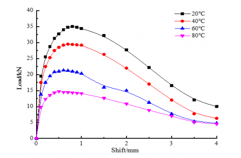 Under the surrounding rock stress, the tensile shear properties of the bolting system depend on the anchor length and bolt diameter. In this sub-section, a steel drum is used to simulate the surrounding rock stress, and a Φ28mm steel cylinder was adopted to simulate the drilling into the surrounding rock. On this basis, a tensile shear test was performed on the bolting system in an environmental chamber. The outer diameter of the bolting system was 14.6mm, and each bolt was grouted to a length of 60mm. The test was carried out at four temperatures (20 °C, 40 °C, 60 °C and 80 °C), and the loading rate of 0.05 mm/s. Figure 4 shows the load-displacement curves at different temperatures.