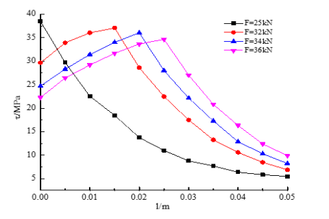 As shown in Figure 6, the shear stress of the bolts gradually decreased along the axial direction, as the load climbed up to 25 kN. As the load increased to 32, 34 and 36 kN, the maximum shear stress of the bolts transferred to the farthest end of bolt. The higher the load, the longer the transfer distance.