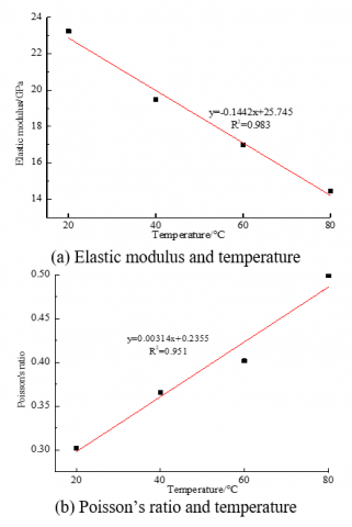 As shown in Figures 2 and 3, the Poisson’s ratio of the bolting system is positively correlated with temperature, while the elastic modulus is negatively correlated with temperature; the thermal expansion coefficient grew almost linearly with the temperature.