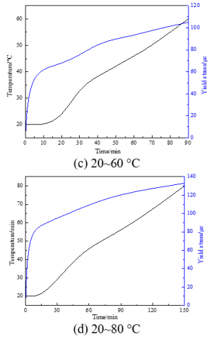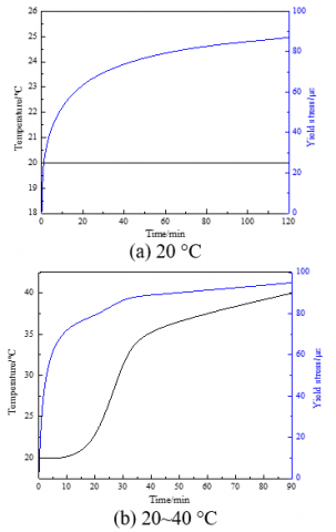 It can be seen from Figure 8 that the yield stress of the sample increased rapidly and then slowly, and reached about 87με after 120 min under the constant temperature of 20 °C; the yield stress surged up early and reached 95με as the temperature rose to 40 °C; the yield stress changed similarly when the temperature increased to 60 and 80 °C, and stood at 105με and 133με, respectively, under the two temperatures.