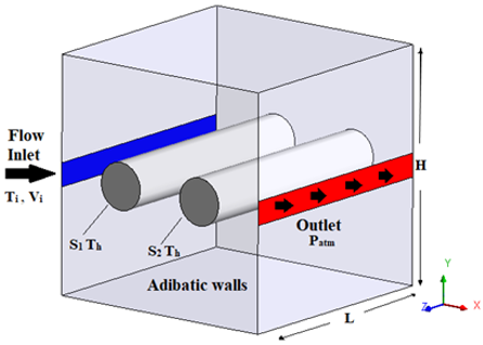 The heat transfer by forced convection from two equal circular cylinders located at the mid-section of cavity with a square shape was examined. The obtained results showed the augmentation in heat transfer rate with increasing the distance between cylinders (Helmaoui et al. [6]). Laidoudi et al. [7] exhibited the profound influence of inlet and outlet ports on the heat transfer from the circular cylinders. Koufi et al. [8] also emphasized the effects of the openings in turbulent heat transfer via mixed convection inside vented enclosures. Gokulavani et al. [9] explored the free convection in cavity containing a heated baffle at its center positioned vertically or horizontally with different configurations of the open cavity on vertical walls, for various Rayleigh numbers, Reynolds numbers and aspect ratios. The vertical baffle was shown to be more effective for augmenting heat transfer compared to the horizontal baffle.